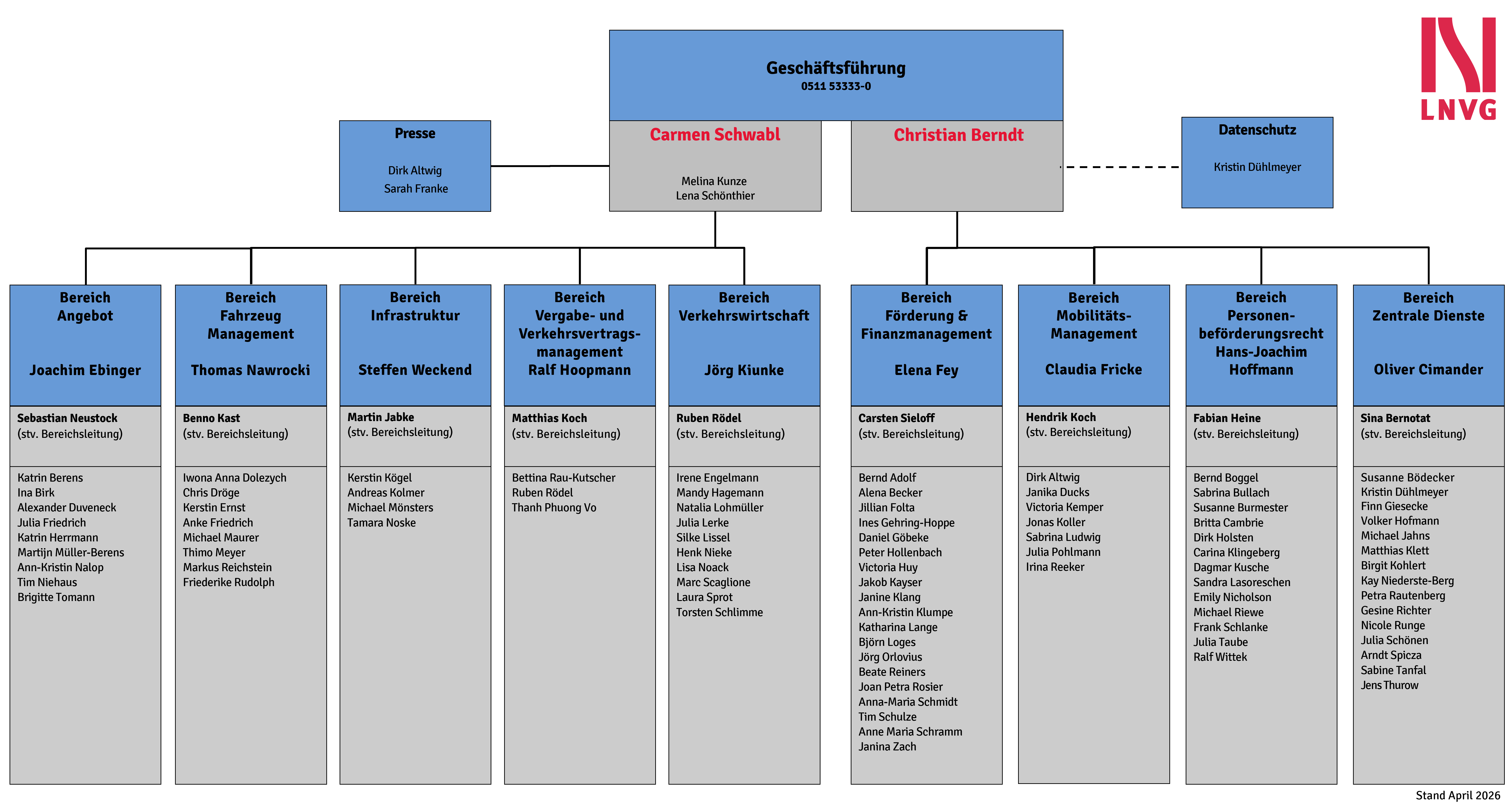 Für alle Mitarbeiterinnen und Mitarbeiter der LNVG sind aus dieser Darstellung die Arbeitsbereiche und auch übergeordnete Funktionen abzulesen.