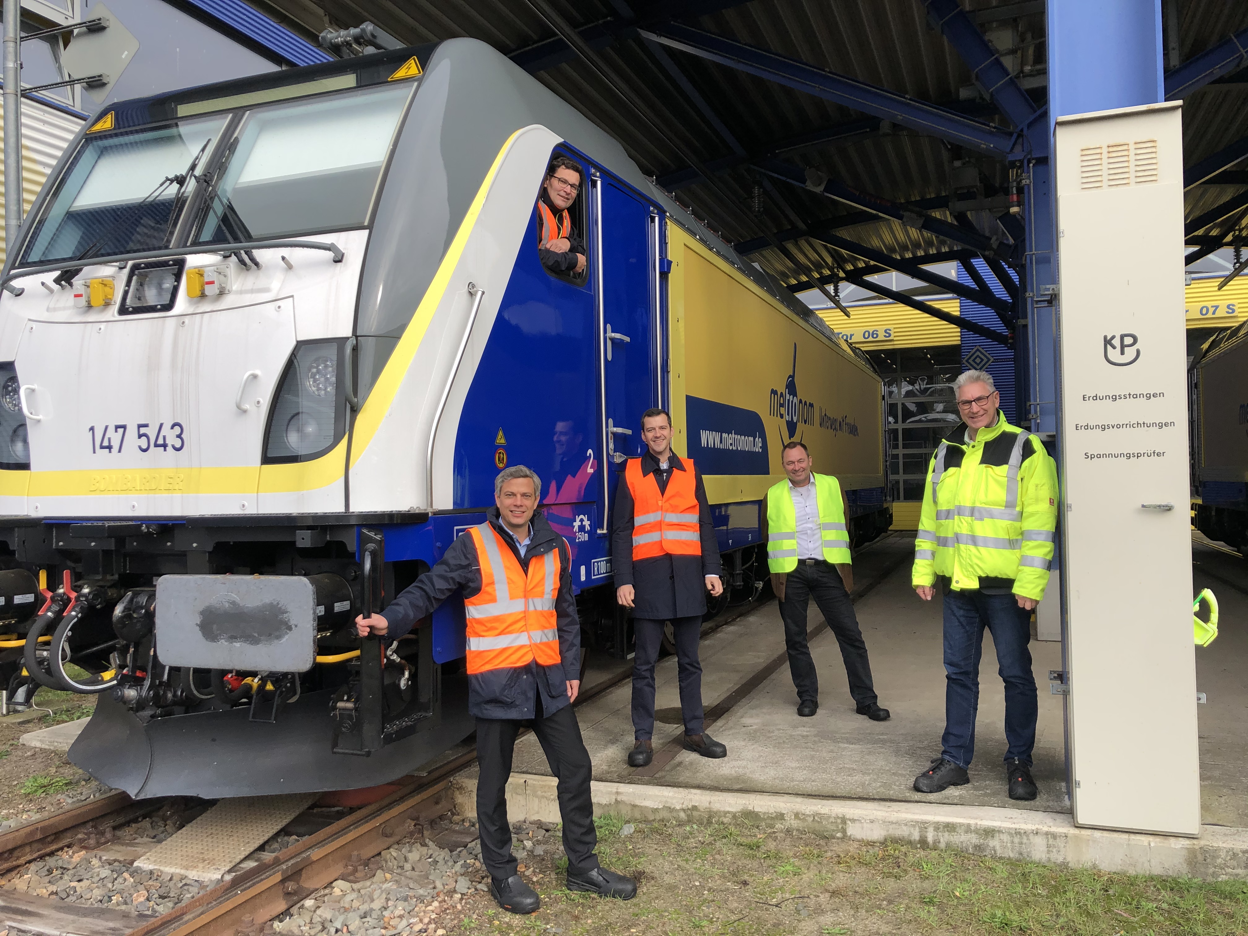 Fahrbereit (von links): Torsten Frahm, technischer Geschäftsführer metronom, Lokführer Guido Scharfenort, Jost Engel Bombardier Transportation, Uwe Weiss, Bombardier Transportation und Thomas Nawrocki, Leiter Fahrzeugpool LNVG. Foto: metronom