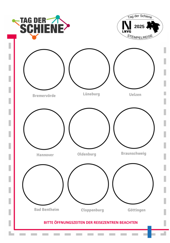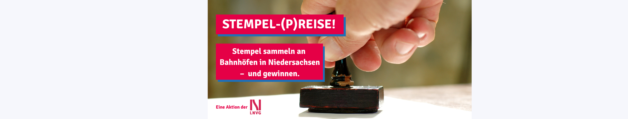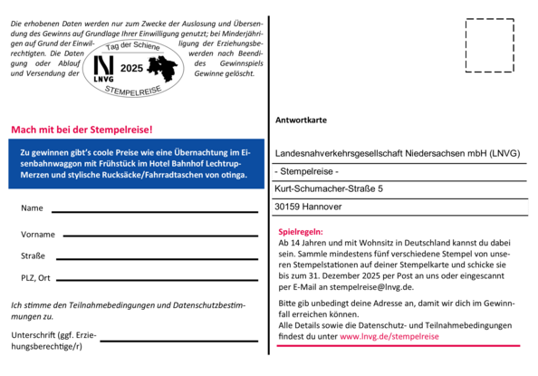 Die Teilnahme am Gewinnspiel erfolgt durch die Einsendung einer Stempelkarte per Post (an die Landesnahverkehrsgesellschaft Niedersachsen mbH (LNVG) | Stempelreise, Kurt-Schumacher-Straße 5, 30159 Hannover) oder per E-Mail an stempelreise@lnvg.de.